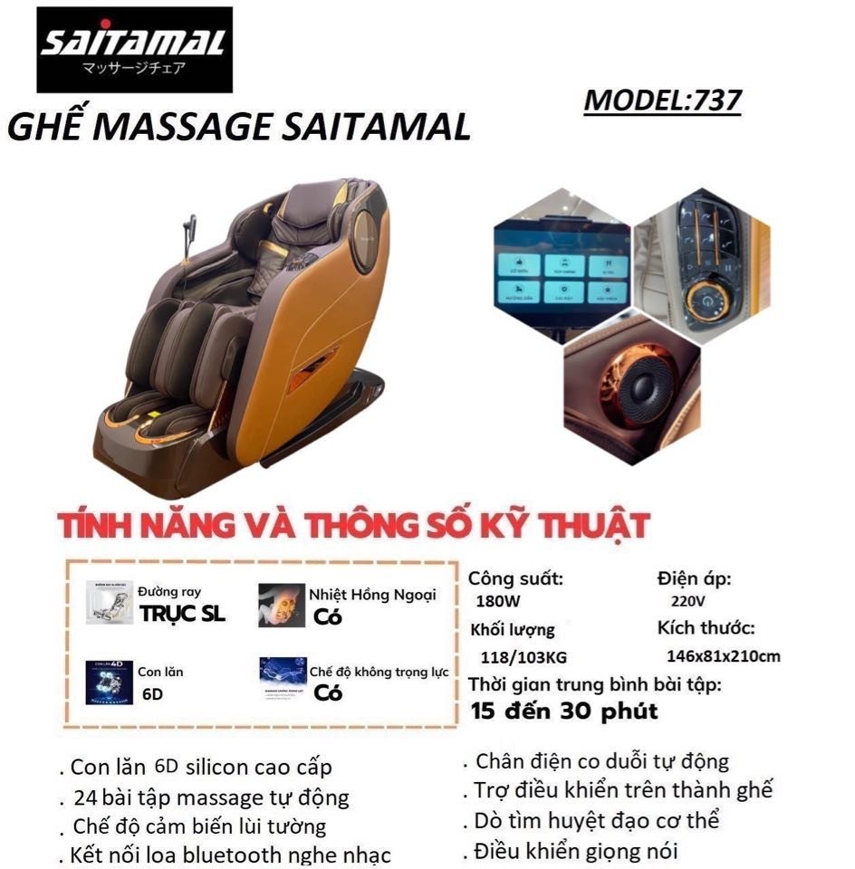 Ghế massage Saitamal 737 là bản model ghế đầu tiên lại Saitamal được phối kết hợp giữa 2 màu nâu và vàng cam vô cùng sang trọng, thời thượng.