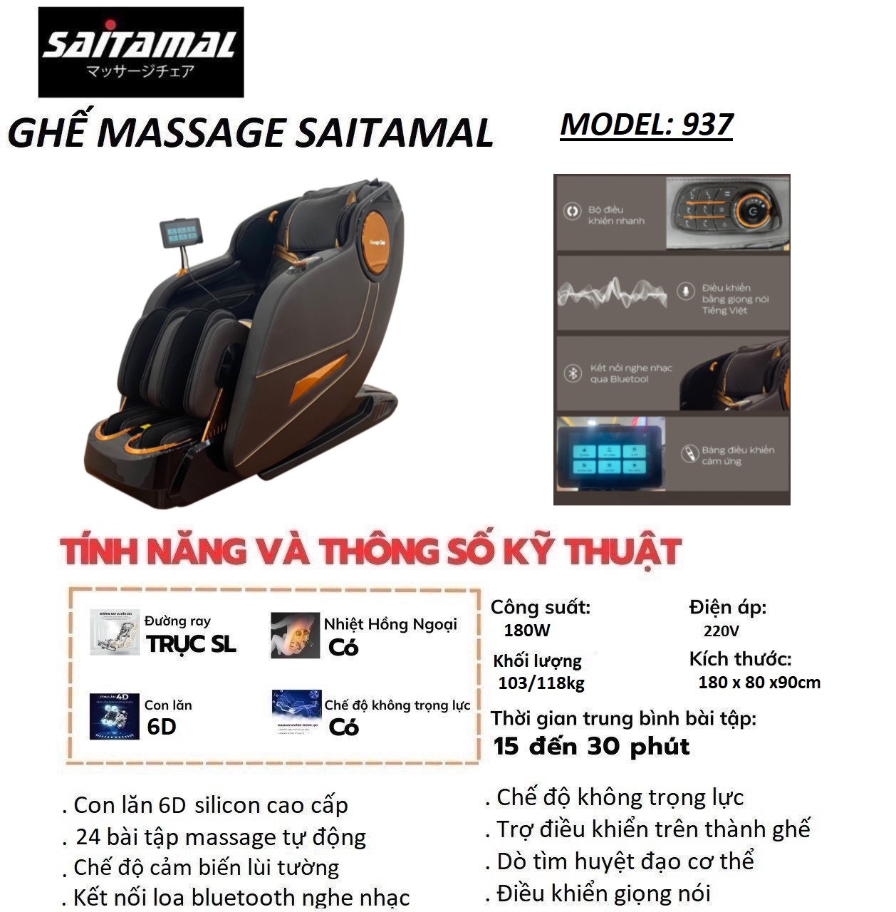 Ghế massage Saitamal 937 đã được tích hợp sẵn tất cả 24 bài tập mát xa tự động được chính các kỹ sư phối hợp dùng đội ngũ chuyên gia Y khoa đầu ngành nghiên cứu. Cuối cùng cho ra đời dòng sản phẩm Saitamal 937 với đặc trưng là sự kết hợp giữa phương pháp massage truyền thống Nhật Bản & công nghệ chăm sóc trị liệu Đông Y Việt Nam.