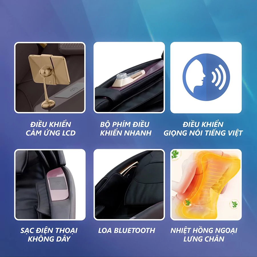 Bộ điều khiển của model Saitamal 918 cũng vô cùng đa dạng và tiện lợi. Nào là màn hình cảm ứng LCD 7 inch đầy màu sắc với các nút chạm bằng Tiếng Việt, còn có hệ thống các phím bấm nhanh được bố trí ngay trên tay ghế với núm xoay điều khiển. Và hơn nữa là khả năng điều khiển bằng giọng nói nhờ công nghệ AI thông minh.