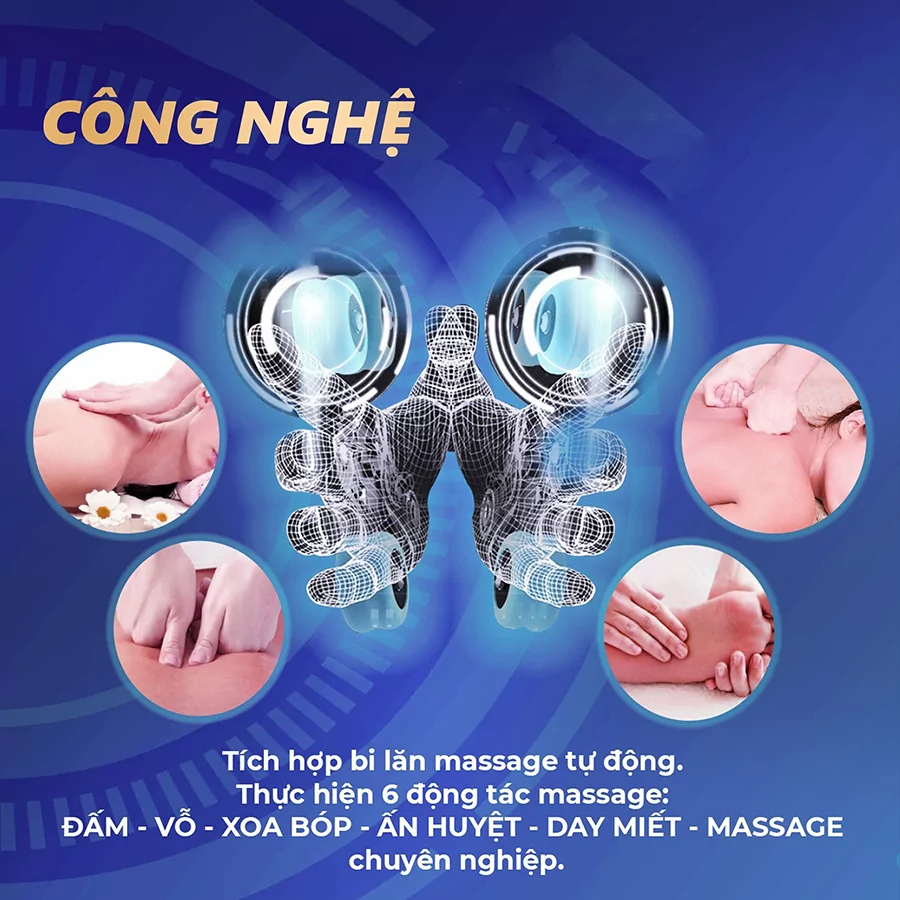 - Bi lăn chân: Hệ thống bi lăn silicone nhỏ, có khả năng xoay chuyển linh hoạt để mô phỏng các kỹ thuật nhào, đấm, vỗ, gõ,…