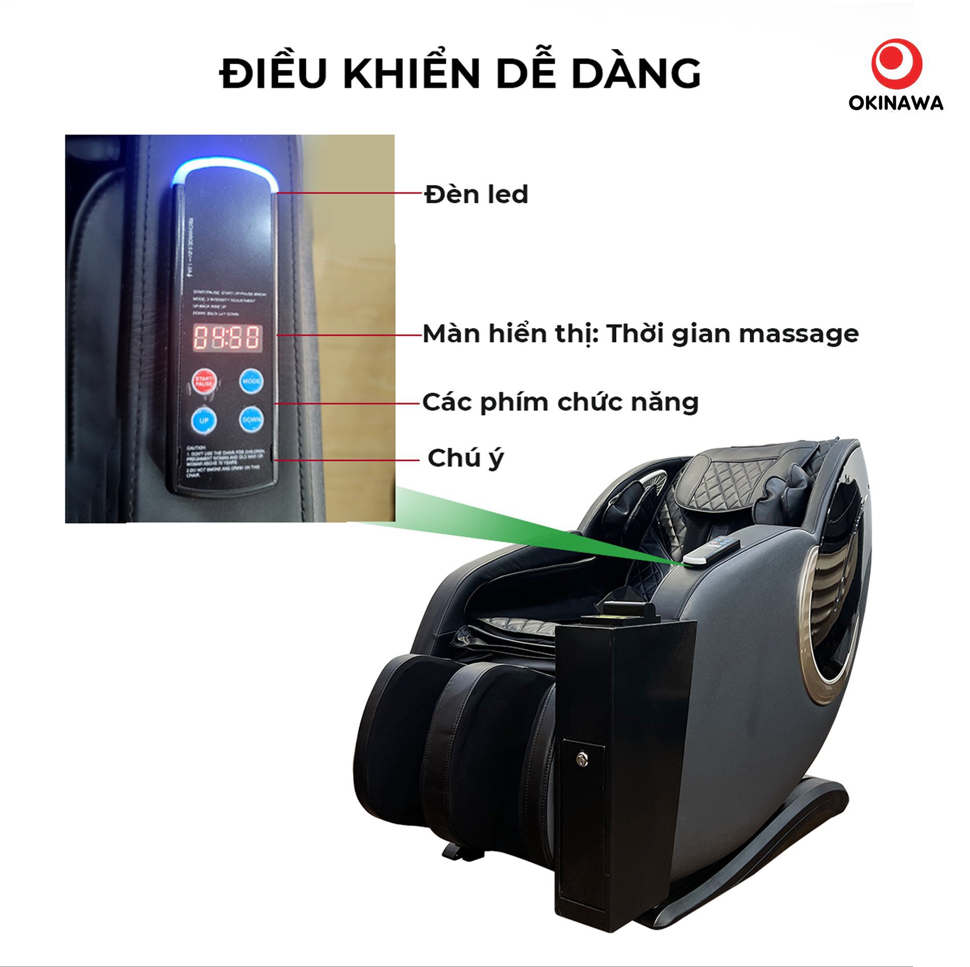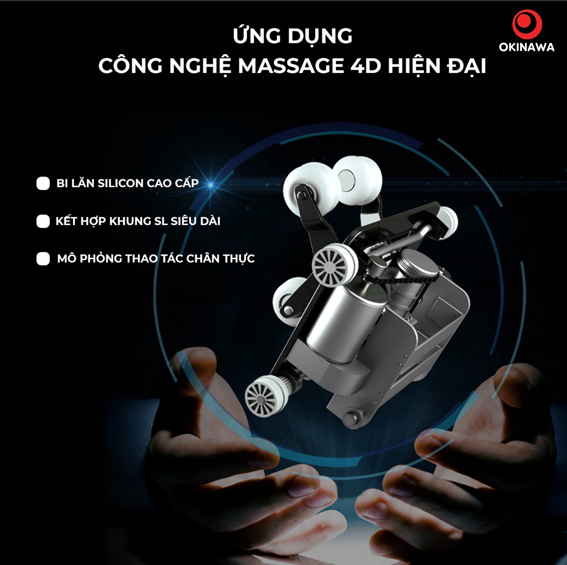 Công nghệ massage cũng là một trong những điểm nhấn ấn tượng giúp tên tuổi của ghế massage kinh doanh Okinawa OS V01 vụt sáng. Sản phẩm này ứng dụng công nghệ massage 4D hiện đại bậc nhất hiện nay bằng hệ thống rô bốt massage 4 cánh tay linh hoạt có khả năng thực hiện nhiều động tác massage phức tạp như đấm, vỗ, day, miết, bấm huyệt, xoa bóp chuyên nghiệp như bàn tay của các chuyên gia.